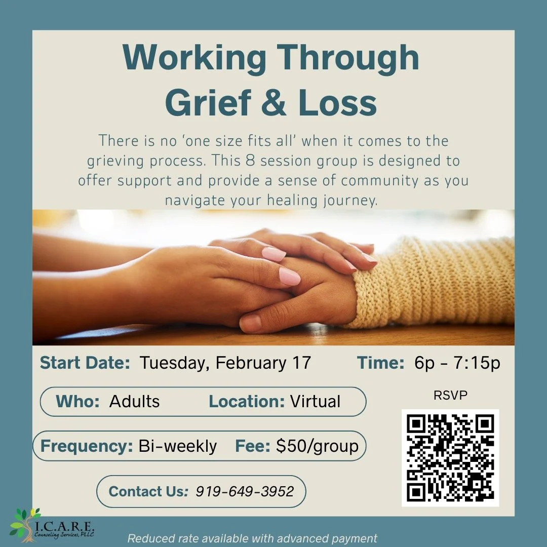 Grief and loss are inevitable parts of life. There is no ‘one size fits all’ when it comes to the grieving process. This group is designed to offer support and provide a sense of community as you navigate your healing journey. Topics will include understanding grief, mourning & bereavement, what I tell myself (exploring my self-script), using symbols for expression, & Meaning Making – the search for answers.